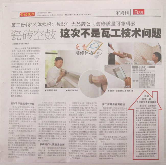 近日,南京知名媒體“金陵晚報”開通了“裝修體檢直通車”服務(wù),邀請廣大正在裝修中的業(yè)主報名,金陵晚報將和驗(yàn)房專家一起走進(jìn)業(yè)主家,驗(yàn)房后出具《家裝體檢報告》,幫助業(yè)主發(fā)現(xiàn)問題并解決問題。